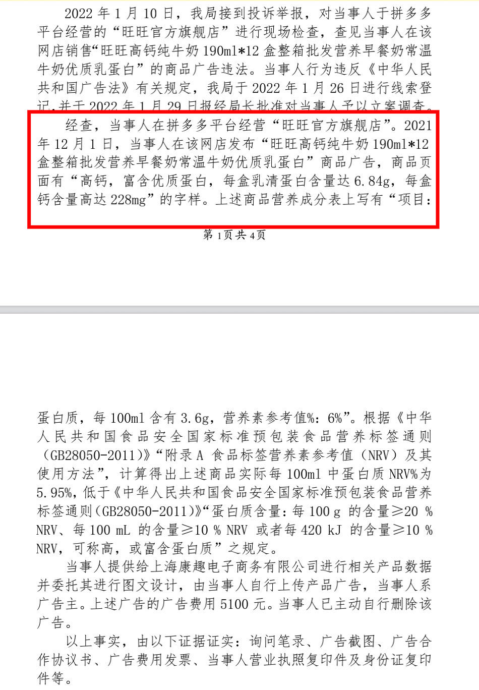 处罚详情显示,当事人在网店发布“旺旺高钙纯牛奶”广告,商品页面有“高钙,富含优质蛋白,每盒乳清蛋白含量达6.84g,每盒钙含量高达228mg”字样,商品营养成分表上写有“项目:蛋白质,每100ml含有3.6g,营养素参考值%:6%”。
