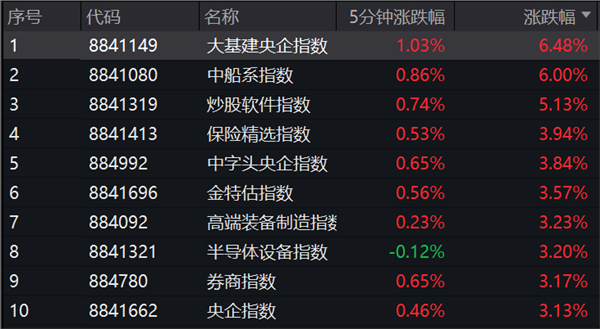 截至记者发稿时,沪指涨1.16%,创业板指涨2.24%,深成指涨1.53%。白酒、保险、煤炭、工程机械、铁路基建等权重板块集体走强。目前,A股总市值超3000亿公司仅紫金矿业一股飘绿,五粮液大涨5%,中国移动、贵州茅台均涨超2%。黄金、旅游、酒店餐饮等前期强势的板块则集体调整。