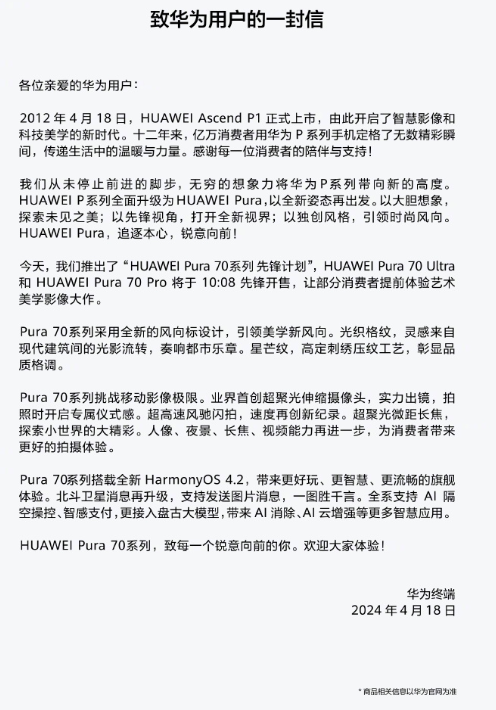 4月18日,华为终端官宣,4月18日10:08,华为Pura70 Ultra、华为Pura 70 Pro开启先锋计划,正式开售。4月22日10:07,华为Pura 70 Pro+、华为Pura 70将先锋开售。几款新品采用三角形风向标设计,价格5499元起。
