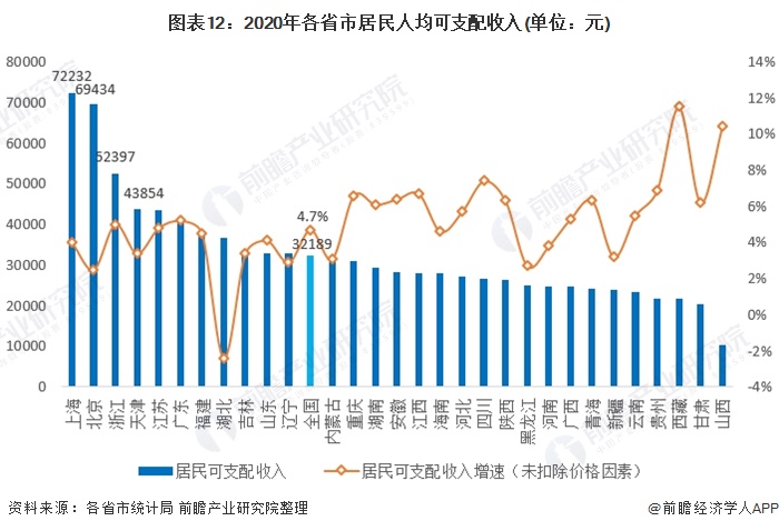 从增速来看,16个省市社会消费品零售总额增速在全国水平以上,但仅有6省市增速为正,最高为贵州,达4.9%。反映2020年疫情对我国消费影响较大。