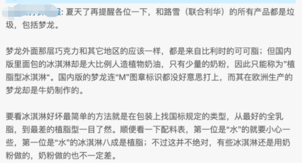 这也就意味着,梦龙承认国内版冰淇淋采用的是植物油,而非牛奶。