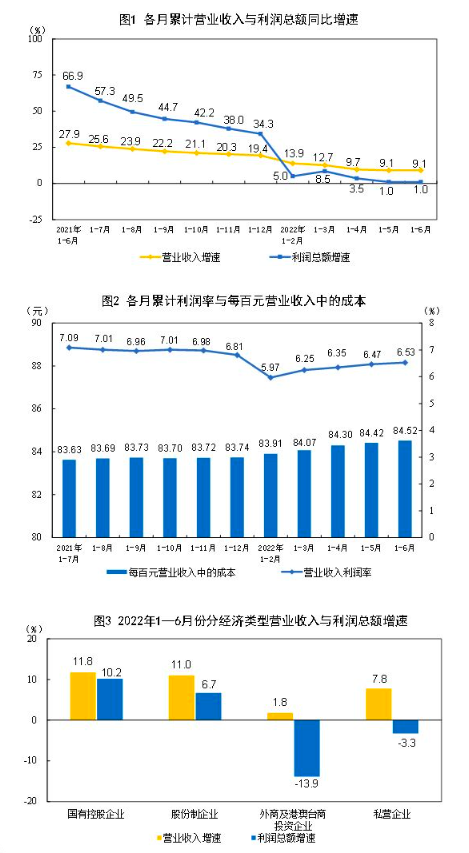 工业企业当月利润由降转增,上半年利润保持小幅增长。二季度以来,受部分地区疫情多发散发影响,工业企业效益承压明显,4月份工业企业利润由增转降且降幅较大。随着疫情得到有效控制,5月份工业企业利润降幅略有收窄,6月份,产业链供应链进一步恢复,工业企业效益明显改善,全国规模以上工业企业利润同比增长0.8%,由连续两个月下降转为正增长,利润增速较上月回升7.3个百分点,呈加速恢复态势。上半年,规模以上工业企业利润同比增长1.0%。