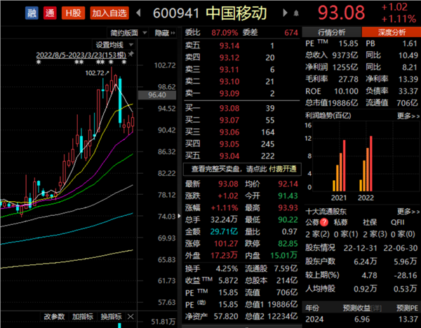 3月23日,又一家“中字头”公司——中国移动发布2022年报。年报显示,中国移动2022年业绩表现亮眼,营收逼近万亿元:2022年实现营收9373亿元,同比增长10.5%;股东应占利润为1255亿元,同比增长8%。
