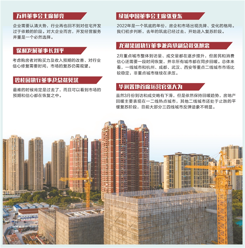 证券时报记者梳理多家房企业绩发布会内容来看,房企高管们一致认为,最艰难的时刻已经过去,当前市场在温和恢复中,但并非所有城市都在同步回暖;虽然3月份成交量略有下滑,但仍好于去年同期。对于今年的市场趋势,多家房企高管表示谨慎乐观,认为市场仍面临不小的压力,可能还会出现波动,若政策持续发力,销售最快或二季度企稳。更有多位房企高管乐观表示,市场短期稳中向好,长期坚定向好。