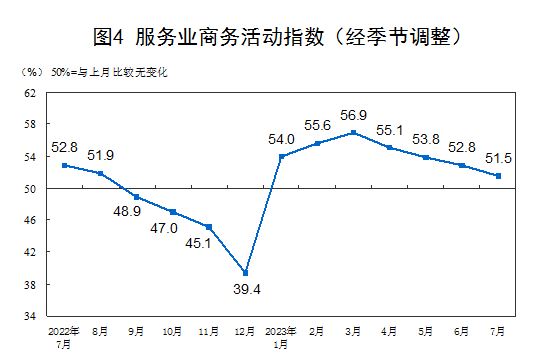 7月份,非制造业商务活动指数为51.5%,比上月下降1.7个百分点,仍高于临界点,非制造业继续保持扩张。