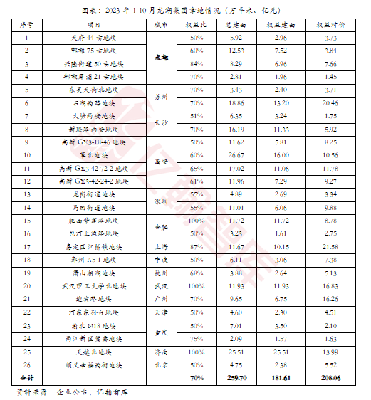 龙湖集团也是核心城市深耕的典型代表,也历来以发展稳健为行业称道,是“绿档”的维持者,也被认为是行业内最安全的民营房企之一。主攻的市场有成都、苏州、长沙、西安、深圳、合肥、上海、苏州、宁波、杭州、武汉、广州、西安、天津等城市,对于锚定的地块也是保持高度热情和全情投入,2023年1-10月,共计拿地26宗,均是企业持续深耕的核心城市,北上广深、成都、苏州、长沙等,总建筑面积260万平米,权益总地价约208亿元。