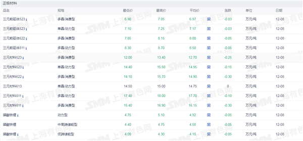 证券之星新能源车行业周报:据上海有色网,截止12月8日,电池级碳酸锂11.2-12.5万元/吨,均价11.85万元/吨,环比上一工作日下滑0.2万元/吨;工业级碳酸锂10.15-10.9万元/吨,均价10.53万元/吨,环比上一工作日下滑0.17万元/吨。12月8日市场中锂盐企业的出货情绪抬升,个别锂盐企业和正极材料以11.2万元/吨价格成交较多的电池级碳酸锂,而盐湖企业和回收锂盐企业观望情绪抬升,并无明显出货打算。近期正极材料企业询价和拿货意愿更为积极,但由于贸易企业盘面套保难以平仓而限制其销售碳酸锂现货,正极材料更多偏向于向锂盐企业采购。但目前正极材料企业反馈其订单无明显增量迹象,其在进行采购并补充碳酸锂原料库存后,对于碳酸锂的采购或也难有持续大幅放量的情况出现。