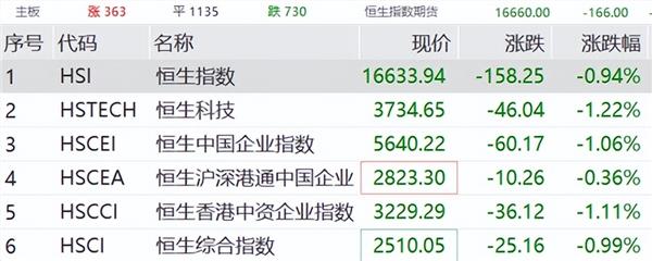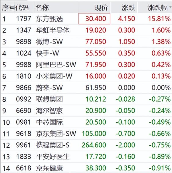 港股市场上,早间三大指数同样低开:恒生指数跌0.73%,恒生国企跌0.84%,恒生科技跌0.85%。开盘后跌幅有所扩大,截至发稿,恒生科技、恒生国企跌超1%。上午东方甄选逆势大涨,领涨恒生科技指数。