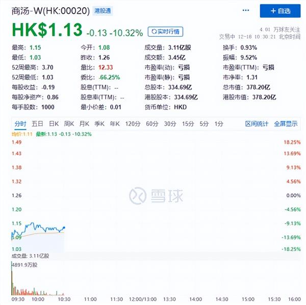 12月18日,港股商汤-W开盘跌超14%,截至发稿跌幅略有收窄,总市值跌破400亿港元。