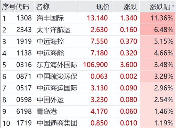 港股航运板块同步走高,海丰国际盘中涨超11%,中远海控、太平洋航运、中远海能等多股走高。
