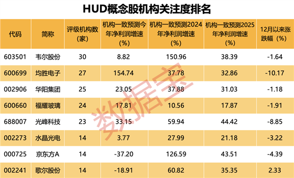 数据宝整理发现,A股HUD概念股仅有8只,且多为机构关注度较高的高成长股。其中,韦尔股份、均胜电子、华阳集团、福耀玻璃、光峰科技等均有20家以上机构评级。