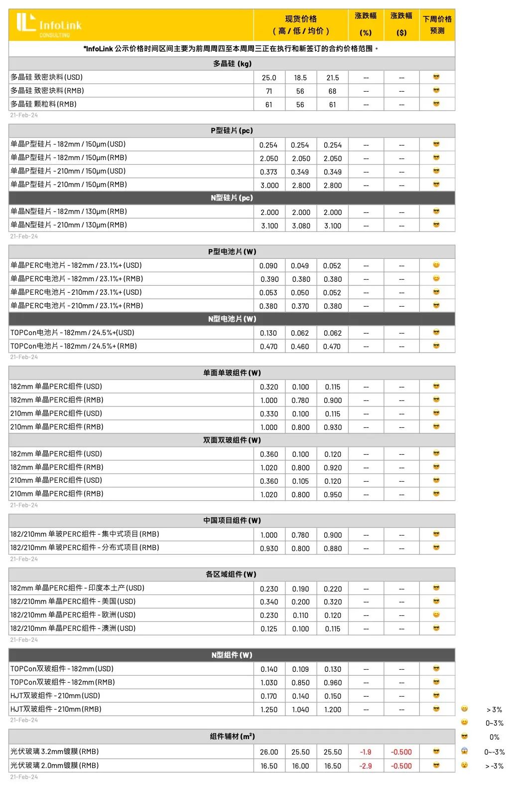 春节假期过后,整体市场需求仍旧疲软,本周基本上仍无太多订单执行,整体价格暂时平稳,本周均价 PERC 0.88-0.9 元人民币,低价仍可见 0.78-0.84 元人民币的价位。TOPCon 价格 0.95-0.98 元左右,中型厂家报价 0.9-0.92 元人民币区间仍在增多,低价 0.85-0.9 仍可见闻。HJT 价格目前国内价格约每瓦 1.04-1.25 元人民币之间,厂家受订单压力,部分厂家让价希望吸引订单,海外订单价格僵持在每瓦 0.140-0.170 元美元。
