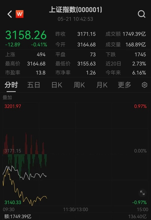 5月21日,A股早间小幅低开后窄幅震荡。截至发稿,主要指数跌幅有所扩大。