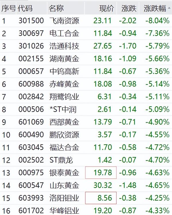 个股方面,飞南资源、电工合金等多股大跌,湖南黄金、赤峰黄金、银泰黄金等跌幅居前。