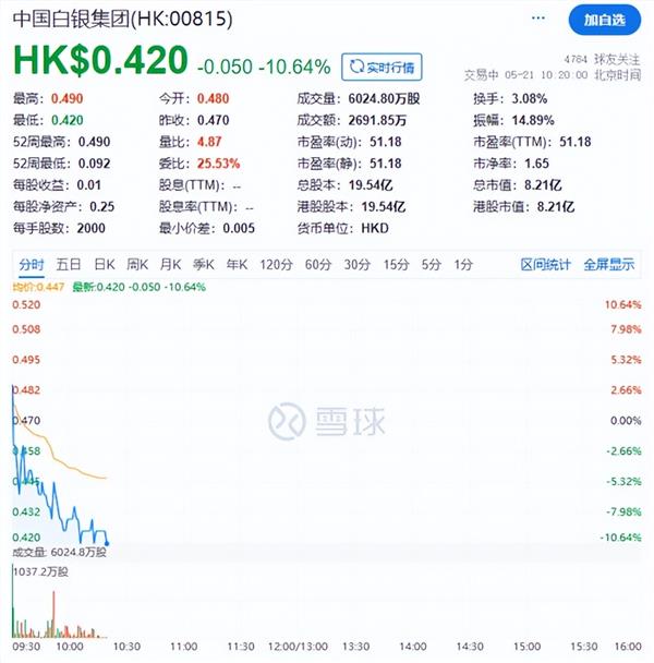 港股中国白银集团,盘中跌超10%,中国黄金国际、中国稀土等跟跌。